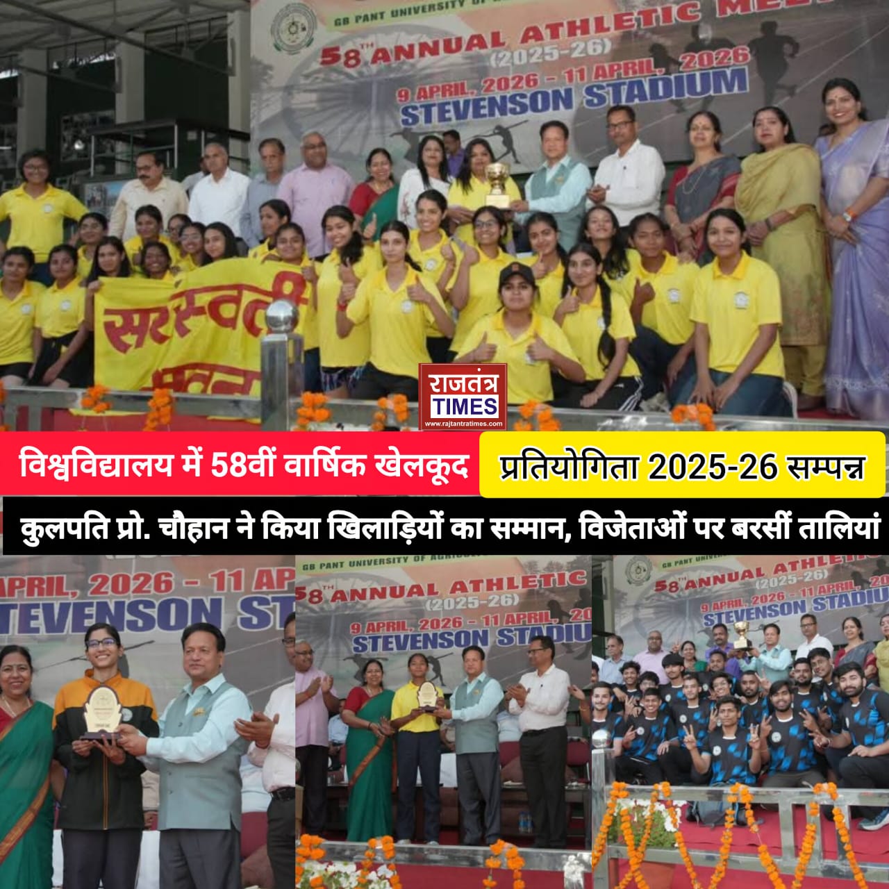 पंतनगर न्यूज़।(राजतंत्र टाइम्स) गोविन्द बल्लभ पंत कृषि एवं प्रौद्योगिक विश्वविद्यालय पंतनगर की 58वीं वार्षिक खेल-कूद प्रतियोगिता 9 से 11 अप्रैल, 2026 तक विश्वविद्यालय के स्टीवेन्सन स्टेडियम में आयोजित की गयी। प्रतियोगिता का शुभारम्भ मुख्य अतिथि विश्वविद्यालय के कुलपति प्रोफेसर मनमोहन सिंह चौहान द्वारा दीप प्रज्ज्वलित कर किया गया तत्पश्चात् विश्वविद्यालय ध्वजारोहण कर मार्च पास्ट में प्रतिभागी छात्रावासों के दलों से सलामी ली। मार्च पास्ट में पंतनगर शिशु मंदिर के विद्यार्थियों ने बैण्ड दल द्वारा नेतृत्व किया गया तथा उनके पीछे एनसीसी कैडेट्स एवं विभिन्न छात्रावासो की टीमें ने मार्च पास्ट किया। विश्वविद्यालय के छात्र अली रहमान एवं अनुप्रिया आर्या ने समस्त प्रतिभागियों को खेल नियमों के साथ प्रतिभाग करने की शपथ दिलायी।