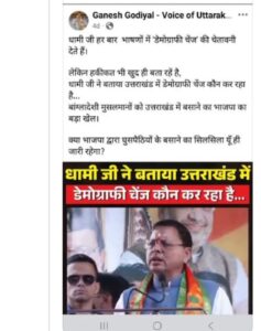 विधायक ने कहा कि ऊधम सिंह नगर में दशकों से निवास कर रहें बंगाली समाज को गणेश गोदियाल वॉइस ऑफ उत्तराखंड कांग्रेस जो पेज दिन रात गणेश गोदियाल की महिमा मंडल कर रहा है। वह पेज 2020 से संचालित हो रहा है। जो इनकी राजनीती गतिविधि को संचालित कर रहा है। उसके माध्यम से बंगाली समाज को घुसपैठिया और डेमोग्राफी चेंज वाला बताया।जिससे उत्तराखंड में जनसंख्या असंतुलन हो रहा है।निश्चित रूप से यह बेहद शर्मनाक घटिया मानसिकता का परिचय है।